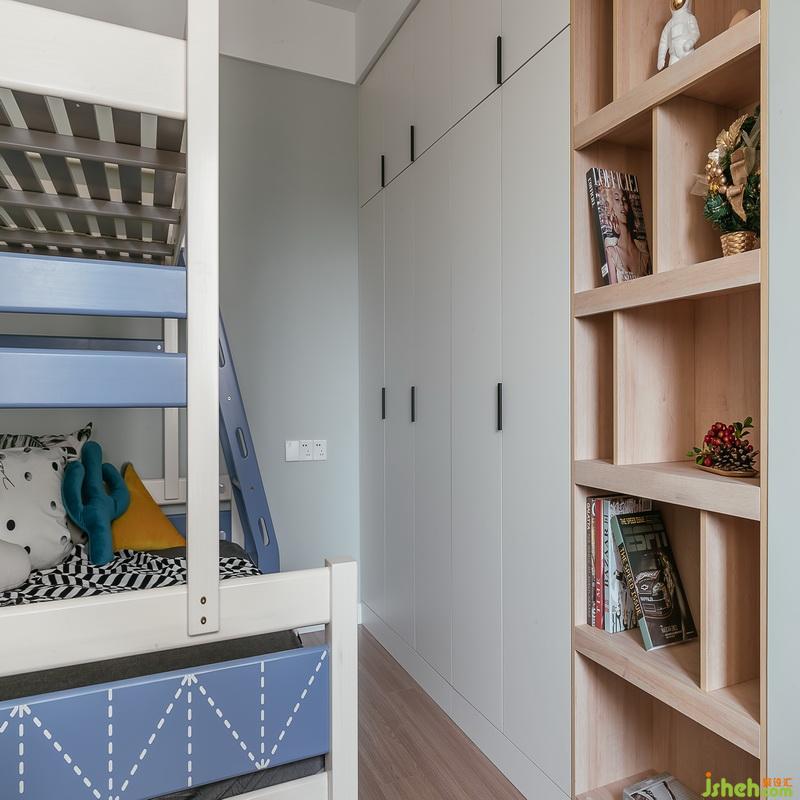 兒童房室內(nèi)設(shè)計(jì)師都設(shè)置了整排的衣柜,最大化的利用空間,有充分空間收納孩子的衣物。