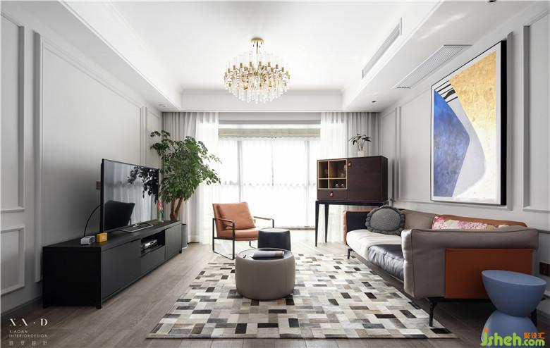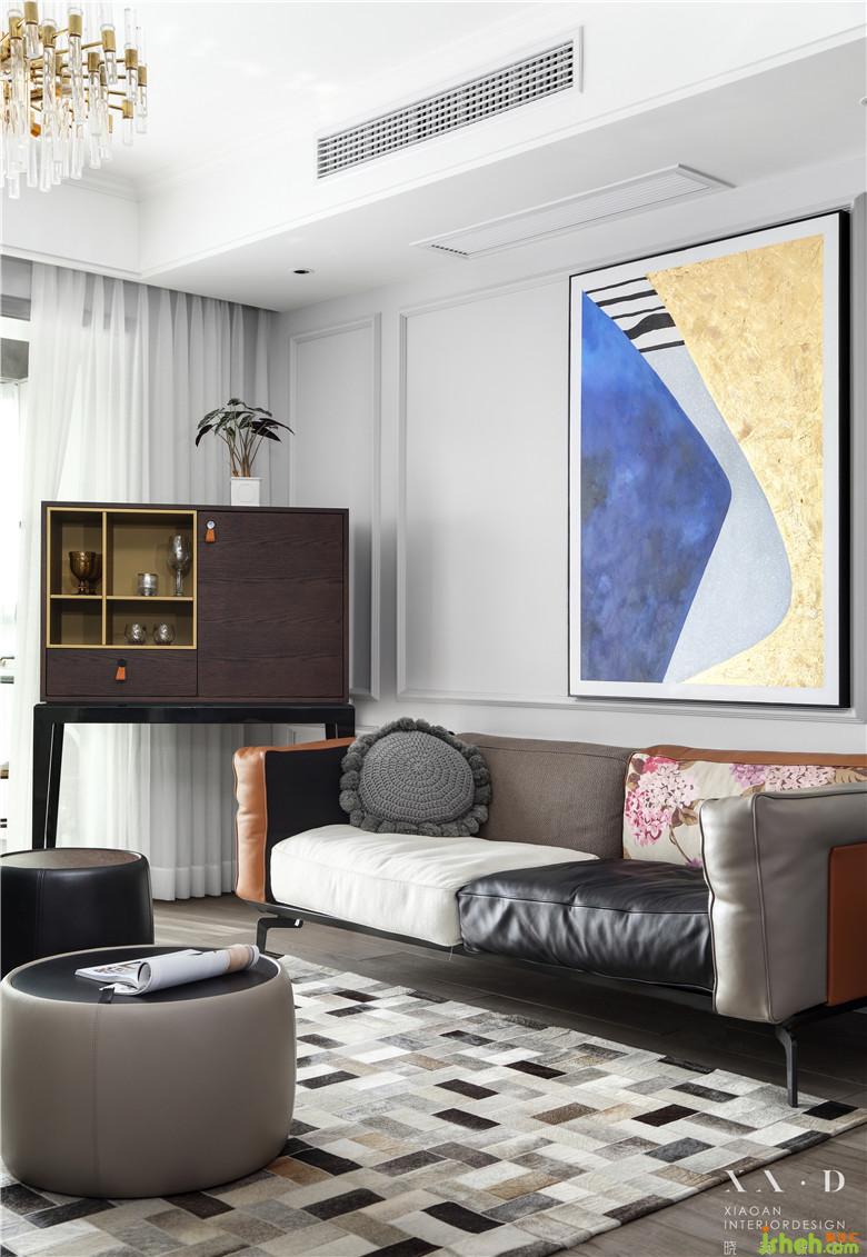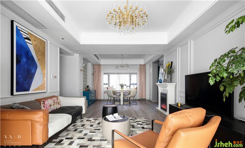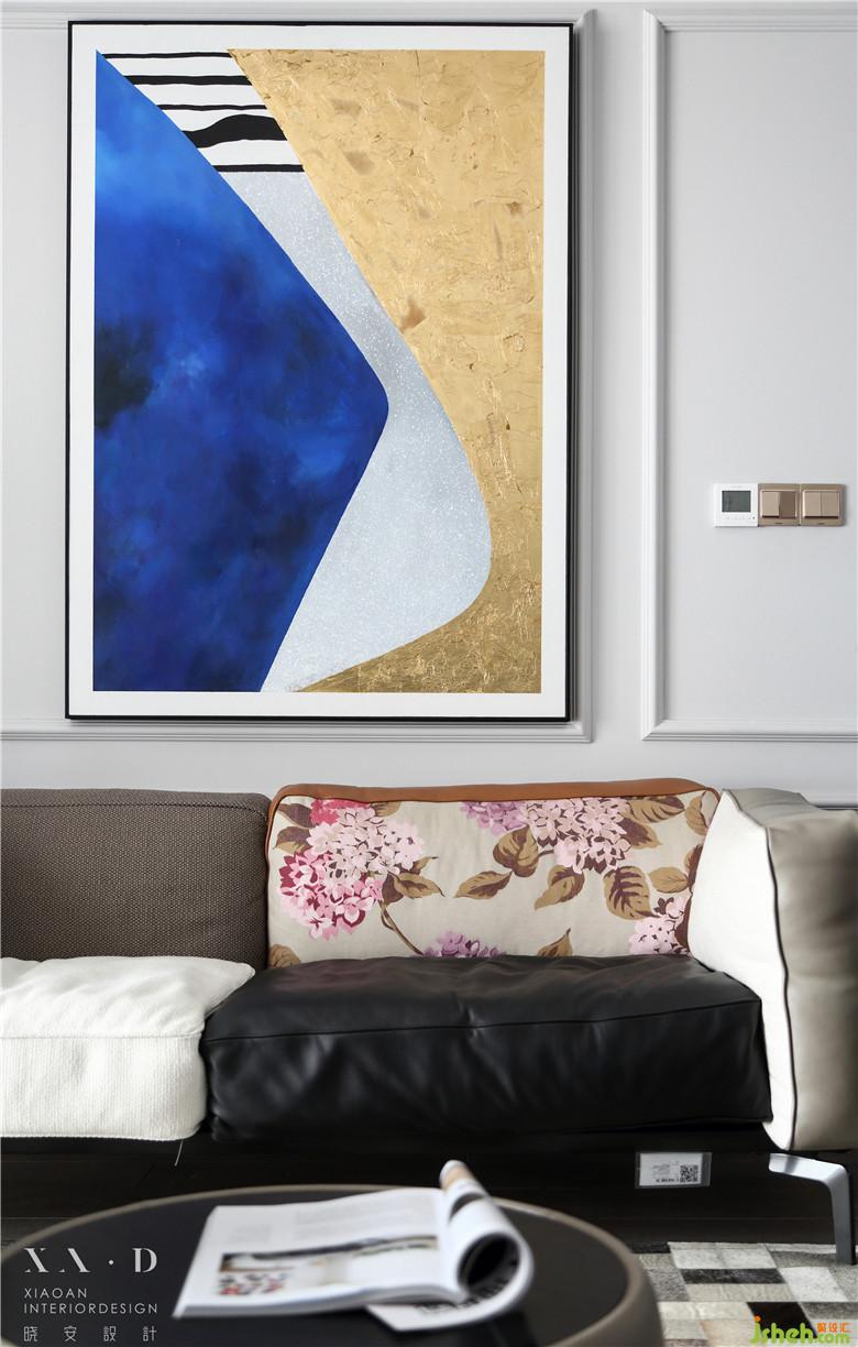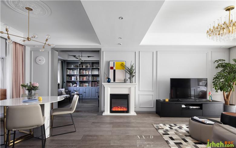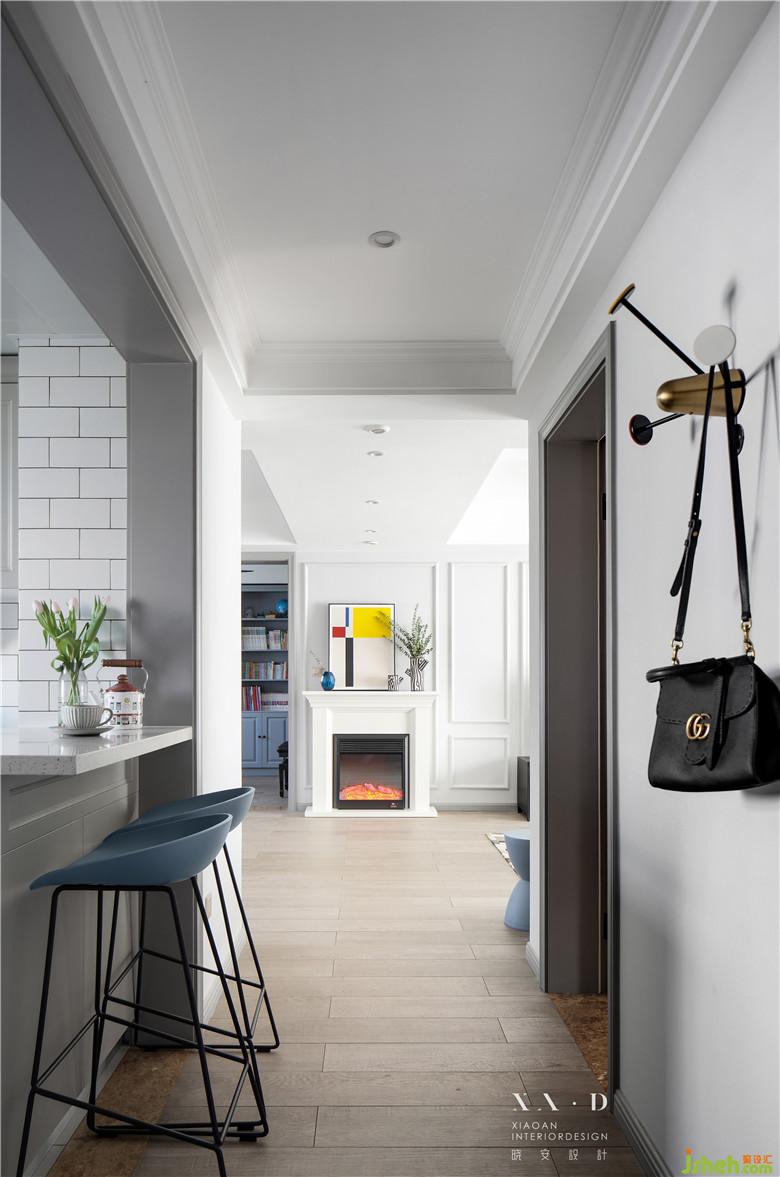 因為把玄關(guān)端景的墻體拆除,從風水學角度來說需要有一個端景作為一個入戶的玄關(guān),室內(nèi)設(shè)計師把原有的過道端口封掉,保證了電視背景墻整體性。玄關(guān)端景處安置的裝飾性壁爐,配上定制的裝飾畫,一進門就會有一種視覺的沖擊力。
