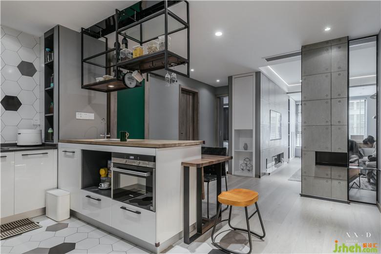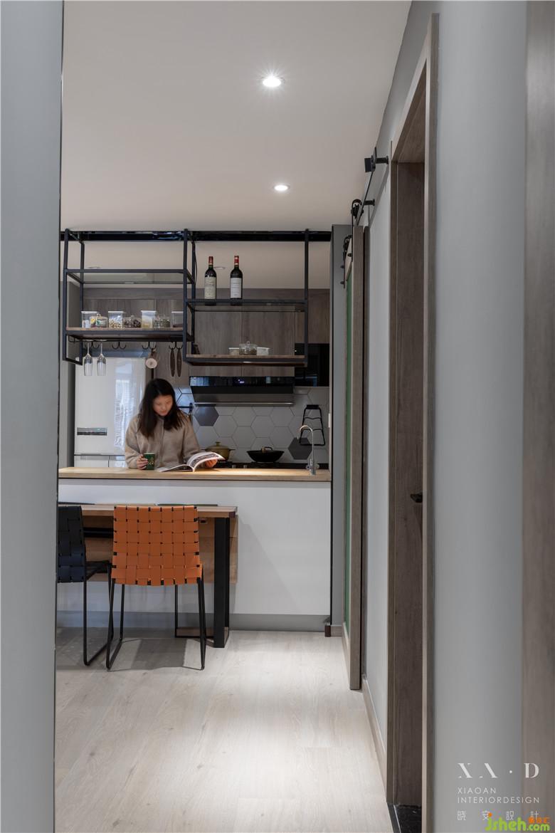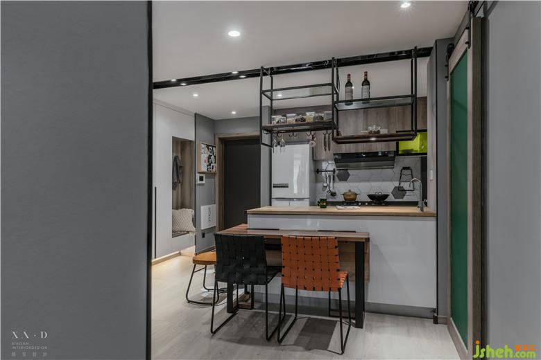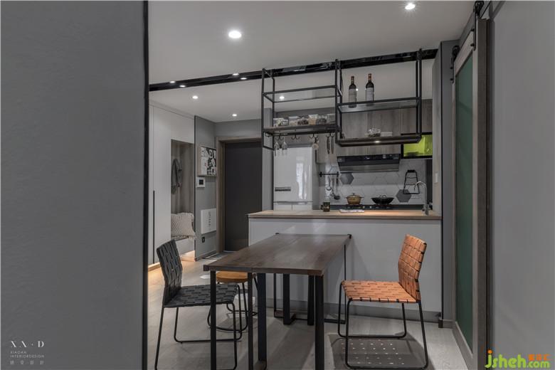 室內(nèi)設(shè)計師設(shè)計開放式的布局讓餐廳通透明亮,餐廳廚房之間的聯(lián)系也更加緊密,島臺上的置物架便于兩個空間收納。折疊的餐桌既可以作為吧臺也可以作為餐桌使用,釋放空間。