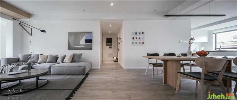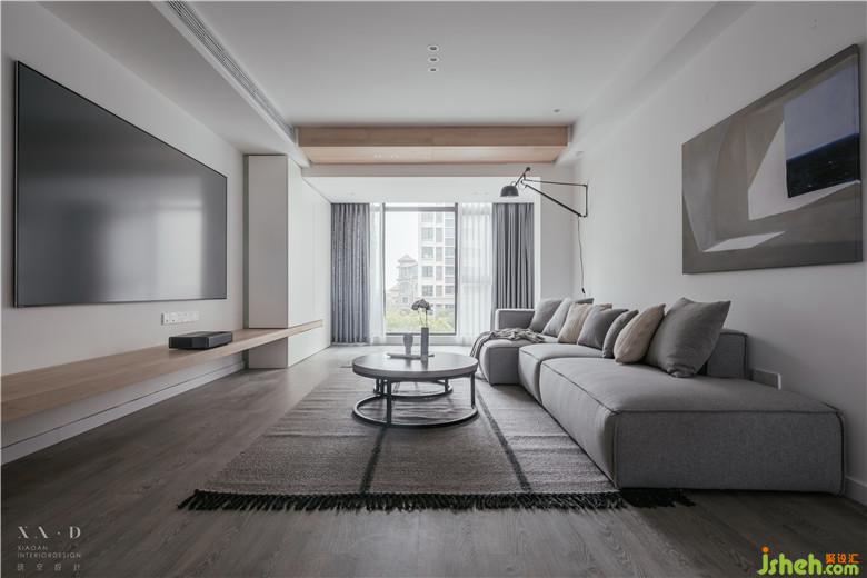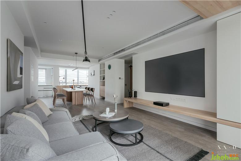 陽臺與客廳相連,頂部用木色做臺階,弱化陽臺門梁。室內設計師使用白色的定制柜體包裹著吊頂,增強了整體性的同時用一條木色貫穿,看似破壞,實則呼應。