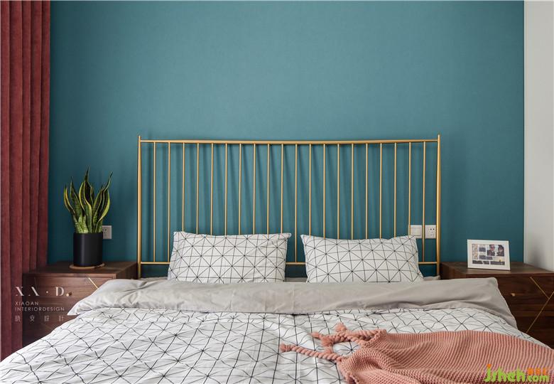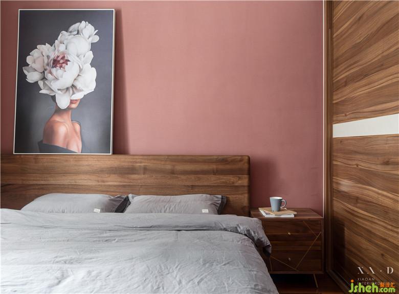 同樣的,主臥室內(nèi)設(shè)計師也是用的粉紅色做墻紙,不過這抹紅更深,搭配木材做的床頭,顯得更加搭配。