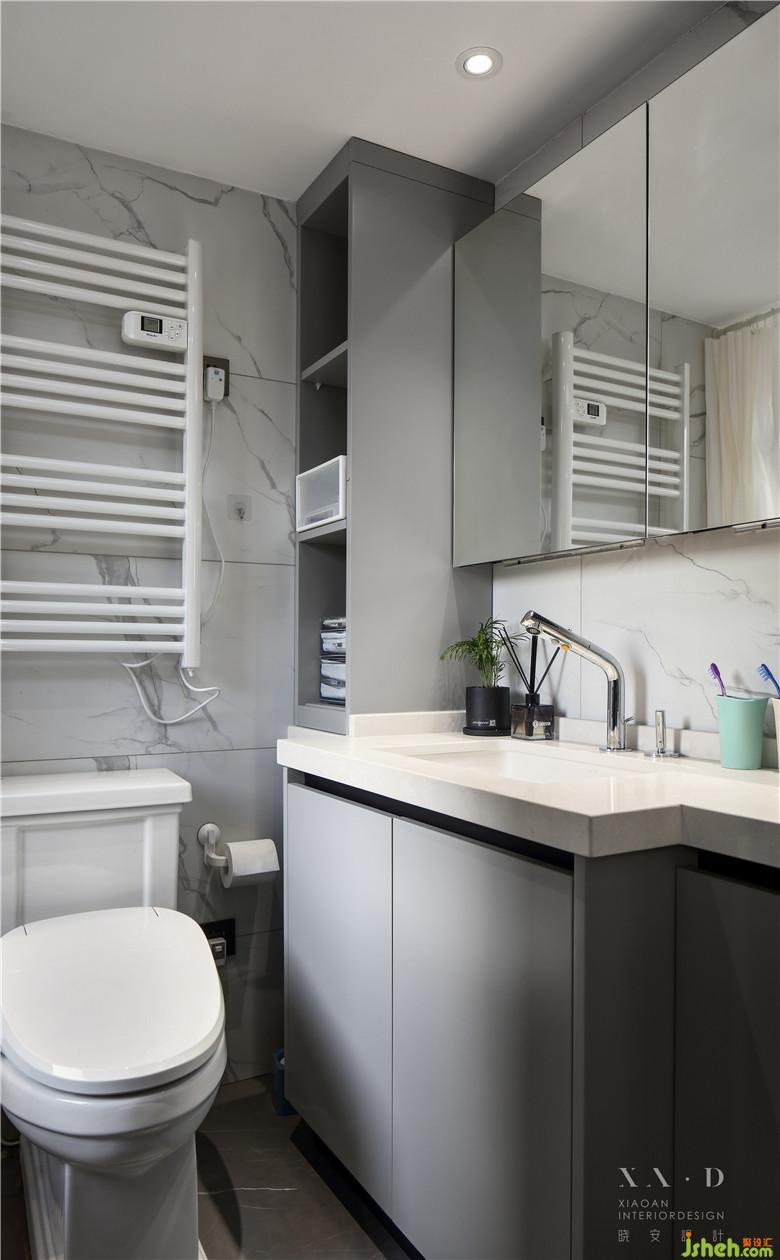主衛(wèi)需要一個(gè)大大的洗漱臺(tái),在格局上將門洞改到了側(cè)面,這樣浴柜鏡柜可以是一個(gè)整體,便于使用。