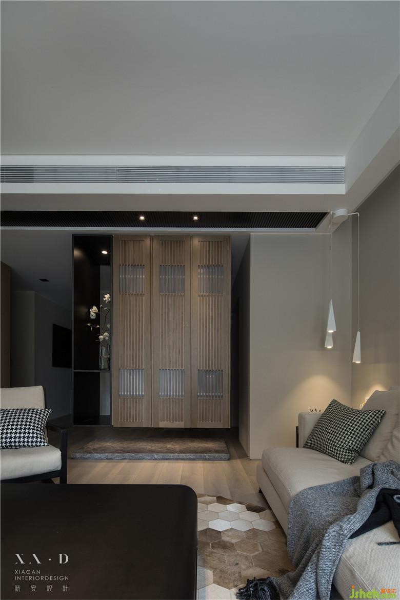 鞋柜完全借由頂部天花的力量懸空存在,木格柵的設(shè)計(jì)手法,更有利于空氣的流通,且有一定的秩序美感。