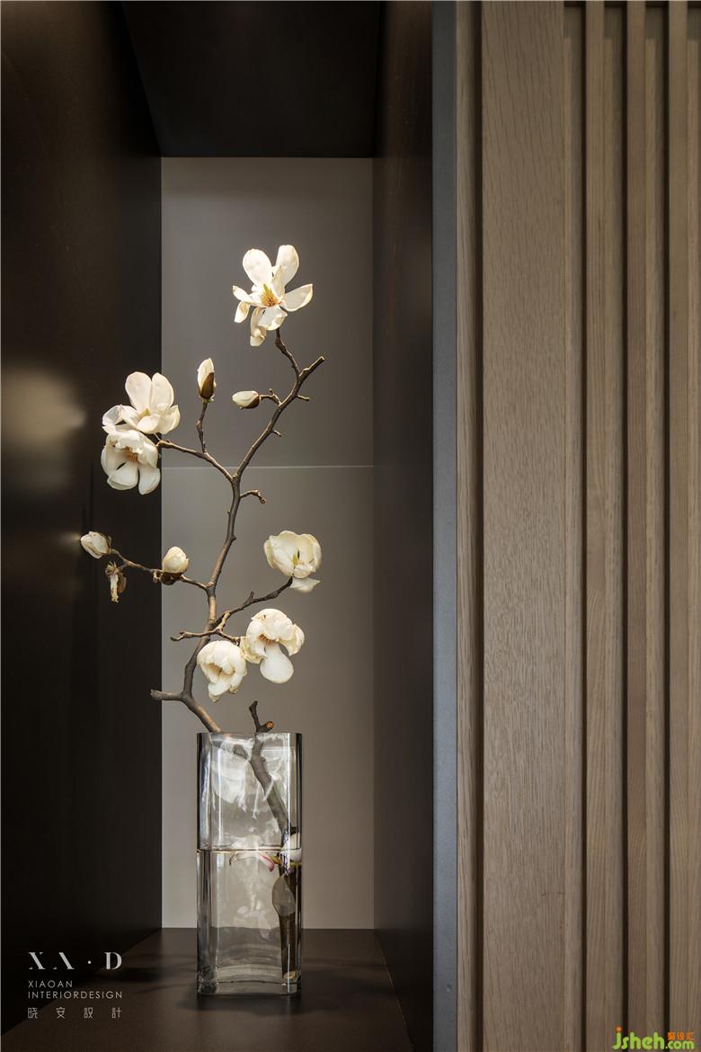 當(dāng)季的白玉蘭花,深色的背景,深淺色系的搭配,使空間更有幾分藝術(shù)美感。