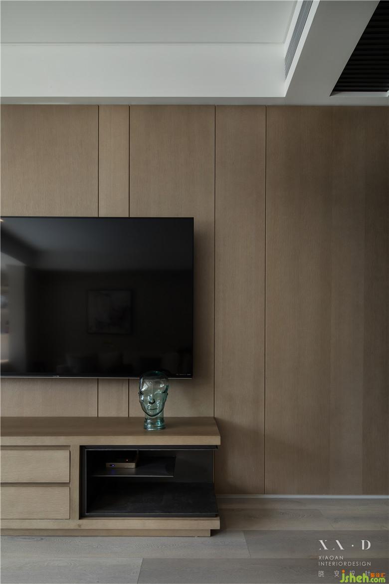 電視墻的設(shè)計(jì)上,室內(nèi)設(shè)計(jì)師采用了染色的鋼刷木皮,優(yōu)雅又不厚重的木飾面,彰顯了屋主非一般的審美觀念。