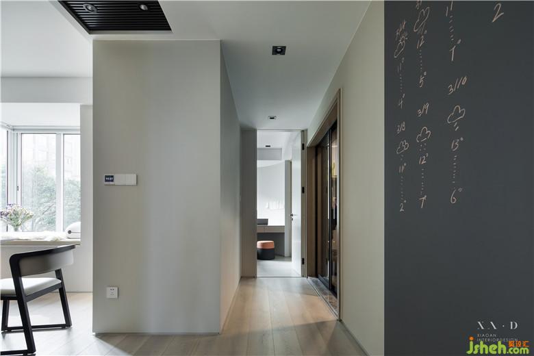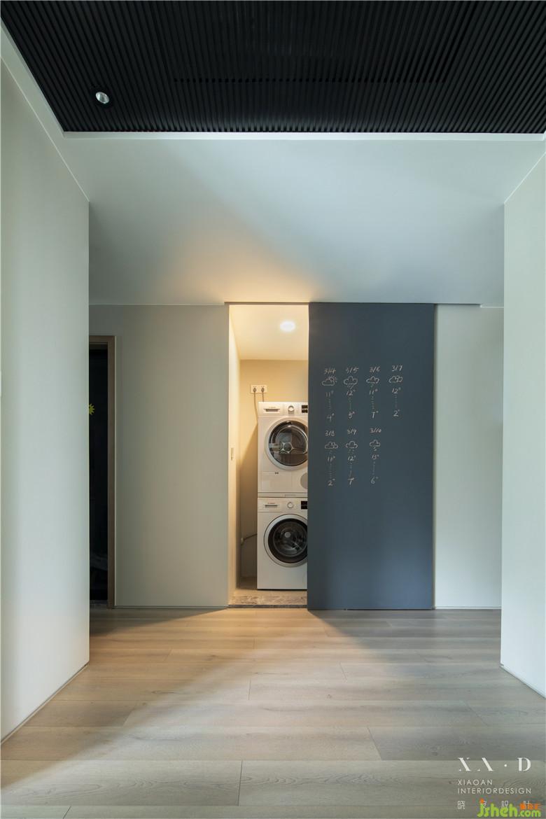 餐廳對面的走廊空間,將原本一個極小的儲物間調(diào)整成洗衣設(shè)備的空間。一片深色的黑板漆移門,形成了生活的另一個趣味,可寫,可畫,樂趣多多。