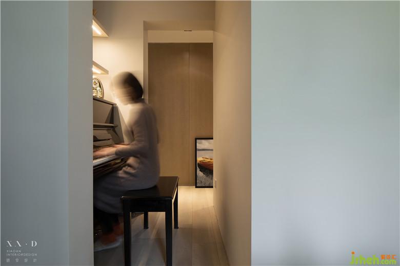 在餐廳連接走廊的位置,拆除了部分墻體。利用承重的U形結(jié)構(gòu),巧妙的置入一架鋼琴,打開的空間環(huán)形的動線,可謂因地制宜。