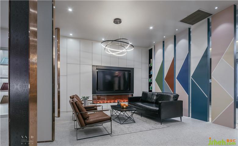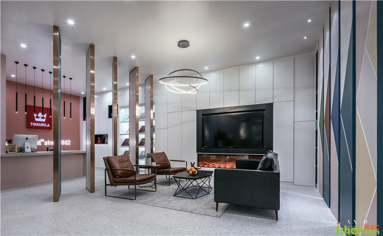 客戶接待區(qū)設(shè)計(jì)成客廳模式,打破一般客戶接待區(qū)的常規(guī),室內(nèi)設(shè)計(jì)師以圍合式的手法擺放家具,使得銷售和客戶有面對(duì)面眼神交流的機(jī)會(huì)。電視背景墻的設(shè)計(jì)延伸到整面墻,把門板的展示空間預(yù)留出來,能使得空間的整體性得到提升。沙發(fā)背面運(yùn)用天地軸的隔斷使得空間有很好的劃分,天地軸的雙面能很好的展示產(chǎn)品的多樣性,也便于后期產(chǎn)品的更換。