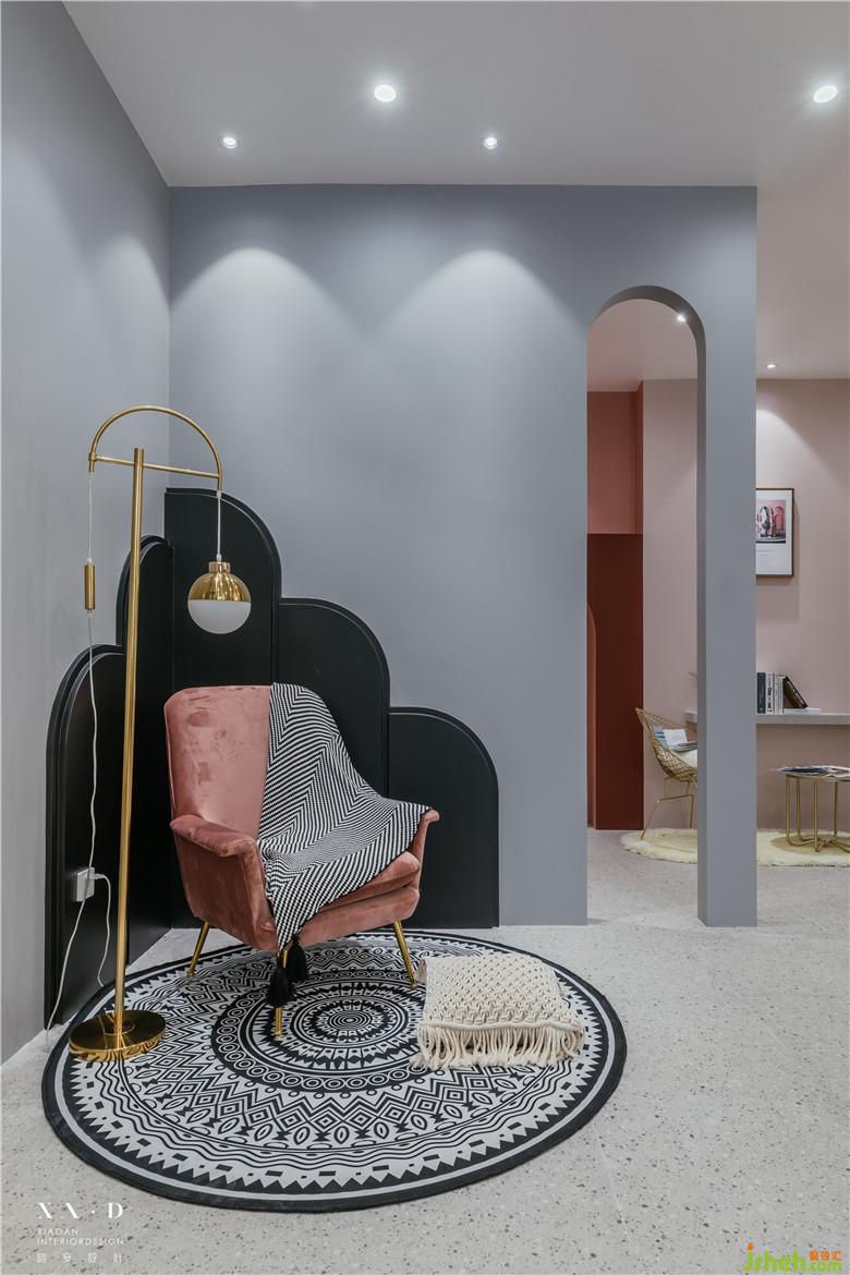 空間的劃分,運(yùn)用多拱門(mén)的方式呈現(xiàn),使得空間的穿透性更具有趣味性?;⌒卧O(shè)計(jì),在空間呈現(xiàn)中更具有建筑語(yǔ)言,透過(guò)弧形門(mén)洞空間看到后面部分的墻面顏色,和前端空間有一個(gè)很好的穿插,使得顏色上有更多的互補(bǔ)和展示。室內(nèi)設(shè)計(jì)師運(yùn)用小景營(yíng)造出更多有意思的空間氛圍。