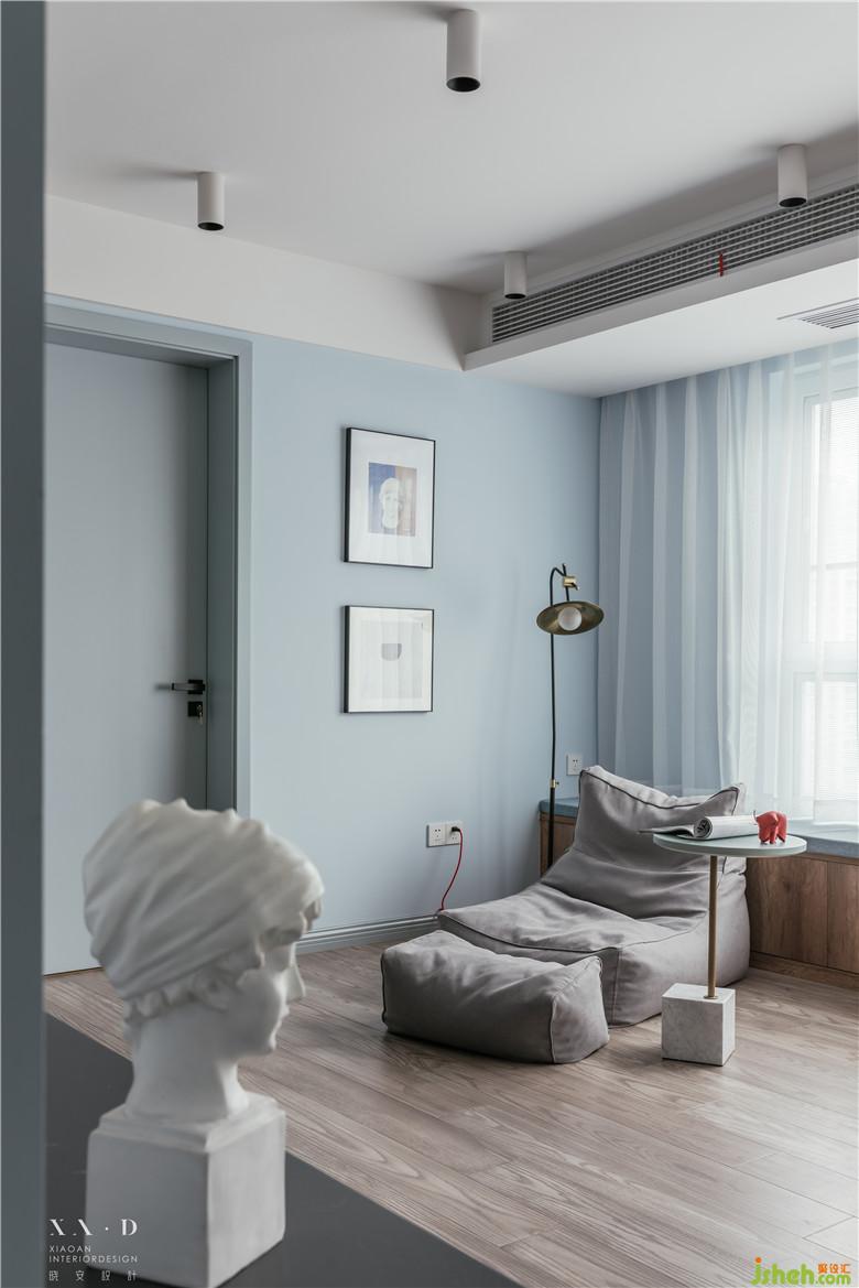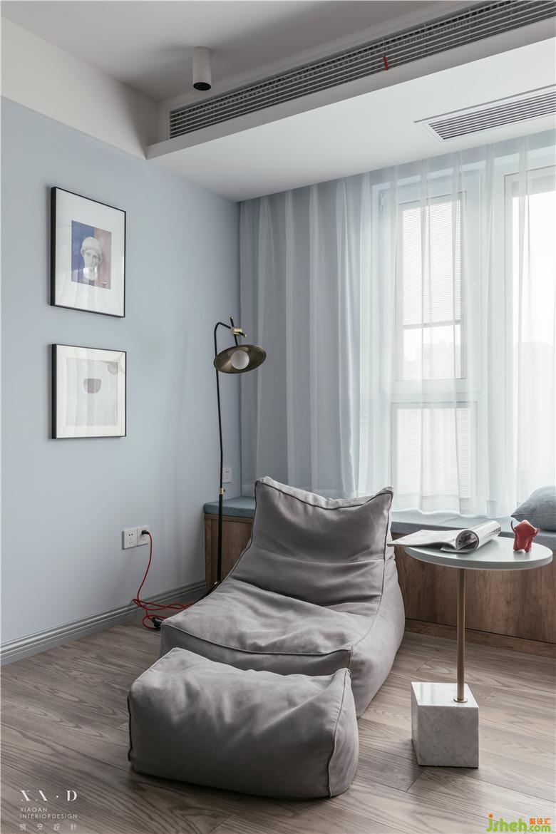 長方形的卡座靠著落地窗,貫穿了整個客餐廳,不論是光線、空間,還是視覺上都很享受。懶人沙發(fā)代替了常規(guī)的沙發(fā),空間更加自由、開闊。