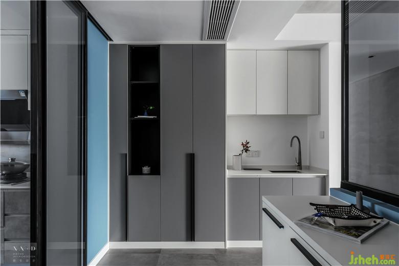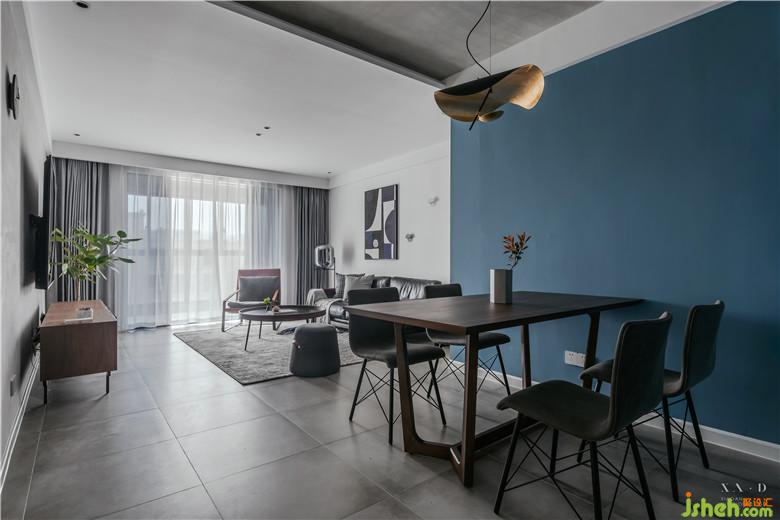 入戶的鞋柜和餐廳做了一定性的組合,室內(nèi)設(shè)計(jì)師將原本的進(jìn)門餐廳空間轉(zhuǎn)化做了一個收納的空間,實(shí)用的同時松緊有度?;宜{(lán)色從餐廳的墻面延伸到玄關(guān),增加空間趣味性。