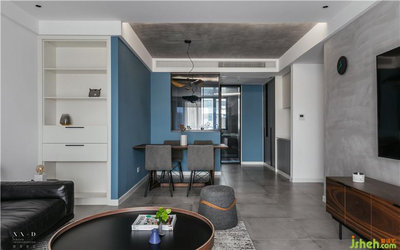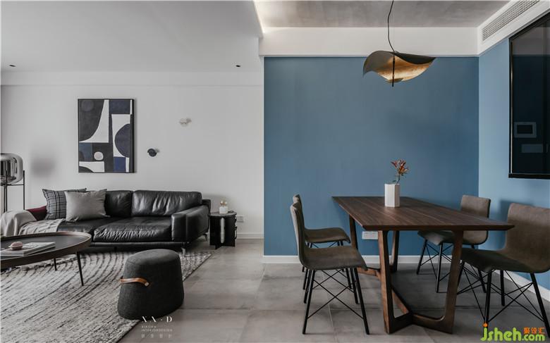 餐廳大面積的藍(lán)灰色與客廳點(diǎn)綴的藍(lán)色交融,胡桃木色的餐桌搭配藍(lán)灰色的墻面,冷暖相宜。藍(lán)灰色的靜謐與胡桃木的融合,整個(gè)空間的氣息浪漫而高級(jí)。