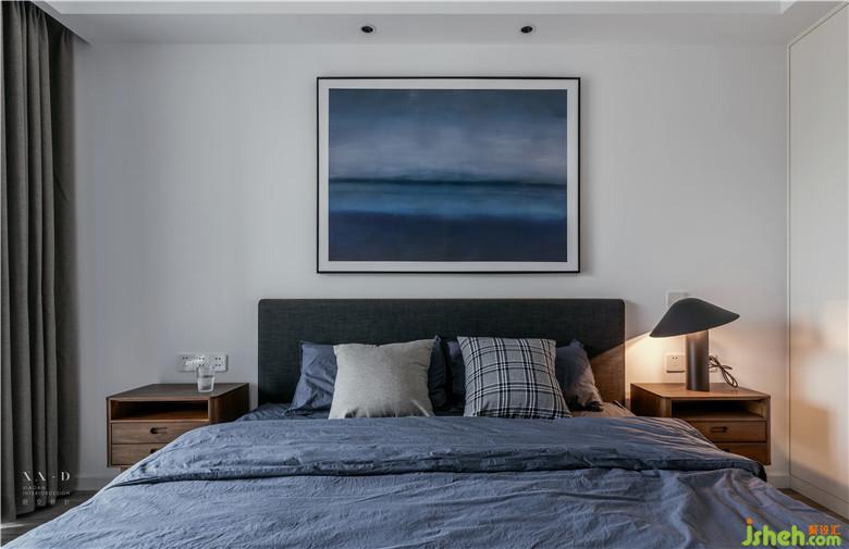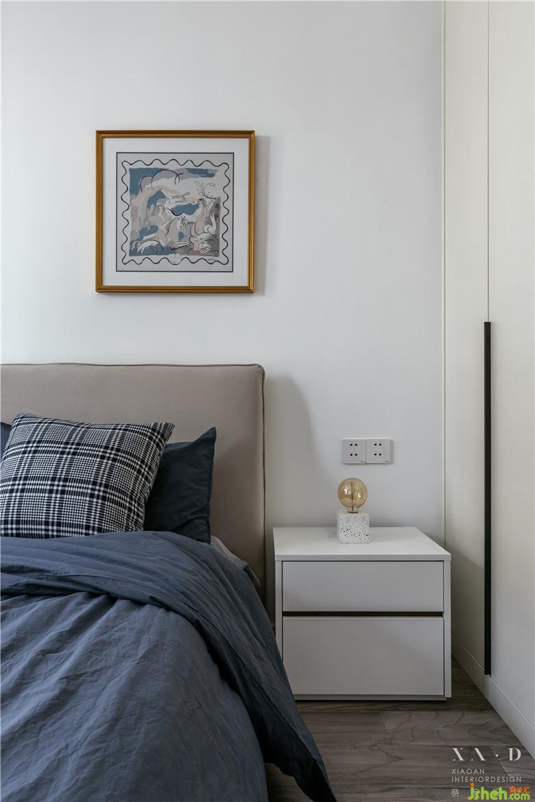 父母房采用了胡桃木家具,白色的墻面使用一幅藍(lán)色的話點(diǎn)綴空間,與整個(gè)空間起到一個(gè)串聯(lián)的作用。