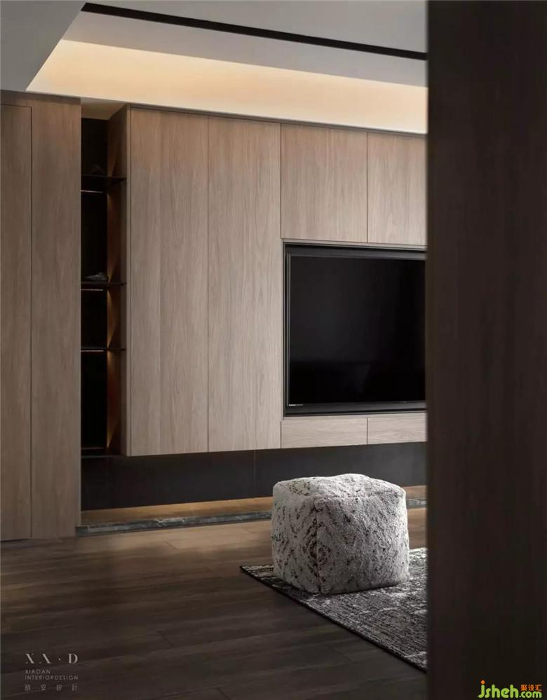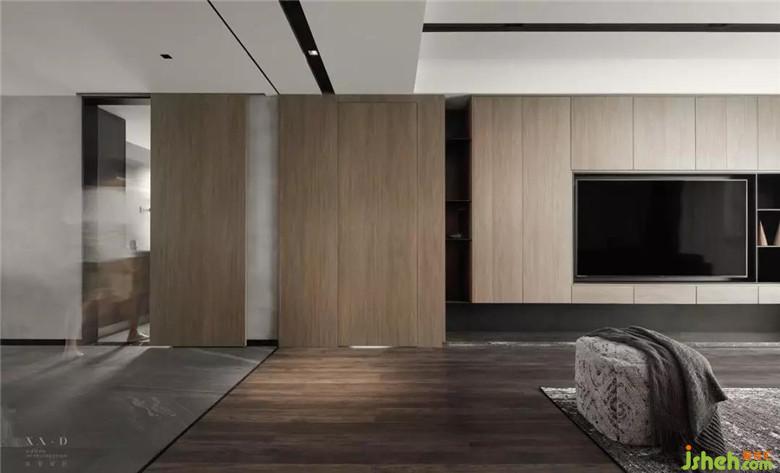 在空間結(jié)構(gòu)的限制下,轉(zhuǎn)化動(dòng)靜區(qū)的功能。延續(xù)元素整合房門及收納的柜體,同時(shí)通過(guò)材質(zhì)的區(qū)分讓空間相互穿透并保持一定的界限,強(qiáng)化場(chǎng)域間層次的變化,讓居住者和空間有個(gè)本質(zhì)傳達(dá)。