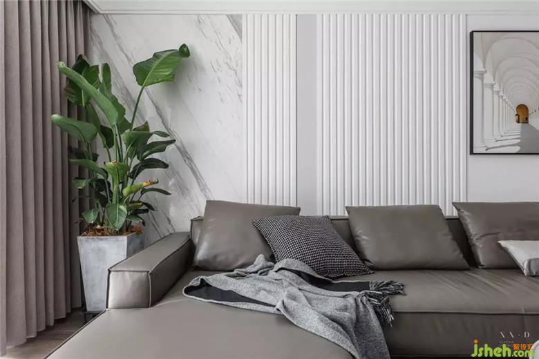 沙發(fā)背景是用石材和豎線條構(gòu)成,家里層高是常規(guī)商品房高度2.8,利用豎線條把層高視覺上下的去拉伸。