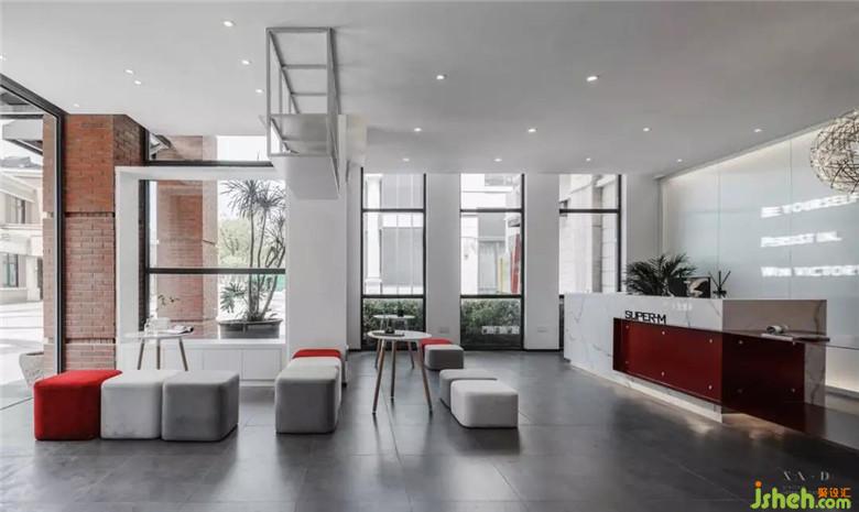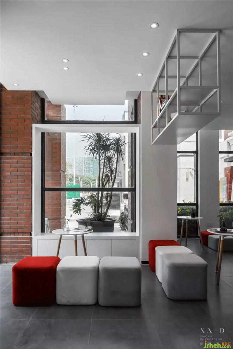 吧臺也用了紅色來點綴整個白色空間,做了懸挑,200公斤的鋼板仿佛掙脫了萬有引力,室內(nèi)設(shè)計師使整個紅色越發(fā)的跳躍且明亮,吧臺懸挑的紅色設(shè)計隱喻了新鮮的血液(教練團隊),帶領(lǐng)我們(健身的人)循環(huán)于心臟的流動,重復(fù)的對抗,沖破,使我們更加健康向上。