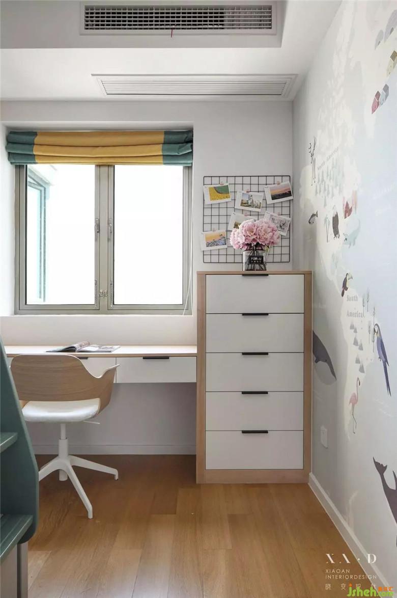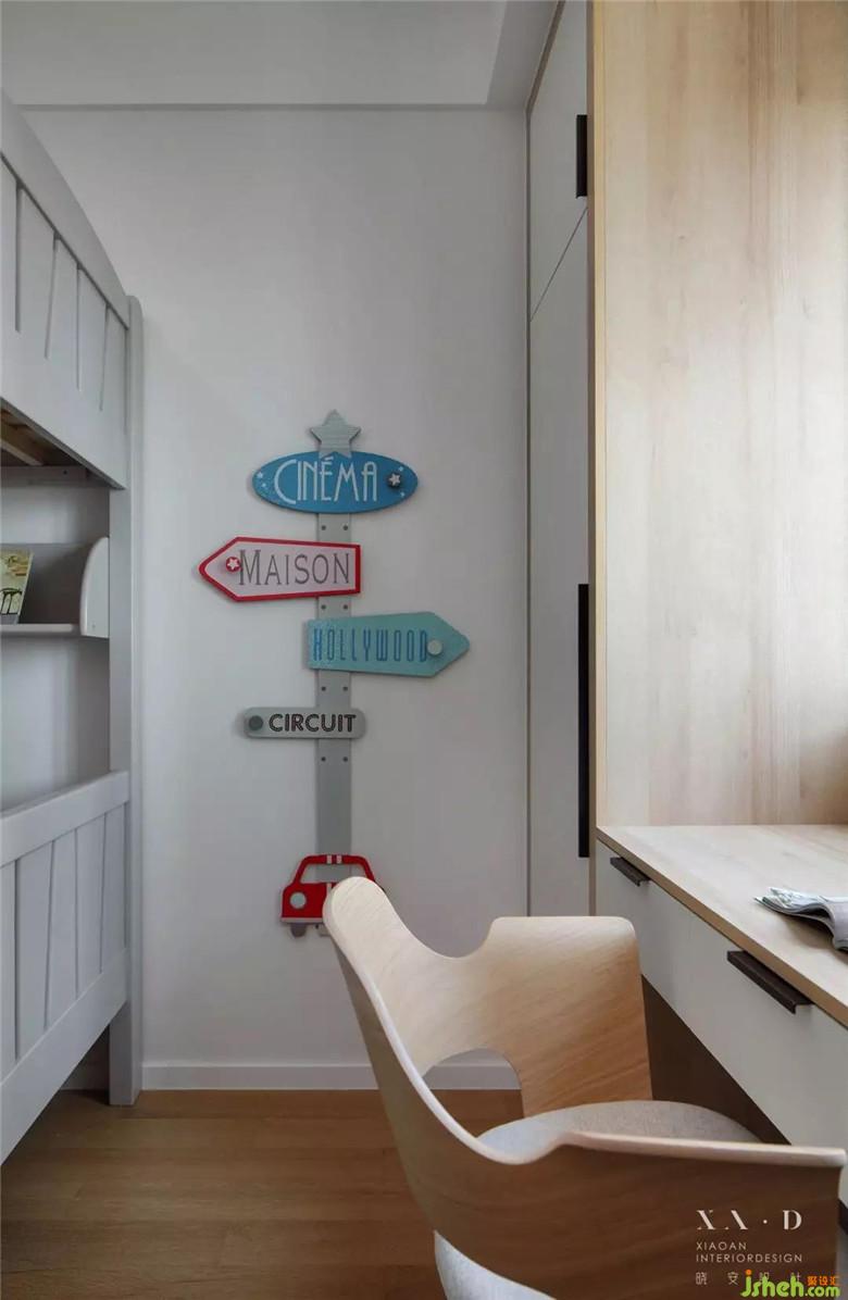 書(shū)桌面對(duì)著窗戶(hù)放置,方便以后姐姐上學(xué)書(shū)寫(xiě)作業(yè)使用。墻面的卡通墻飾既可以?huà)鞏|西又增添了空間的童趣,五斗柜上方的格子鐵架放置孩子們?nèi)粘5木仕查g影像,給孩子們留下一個(gè)美好的童年記憶。