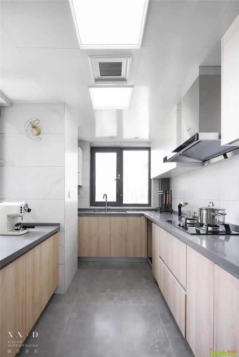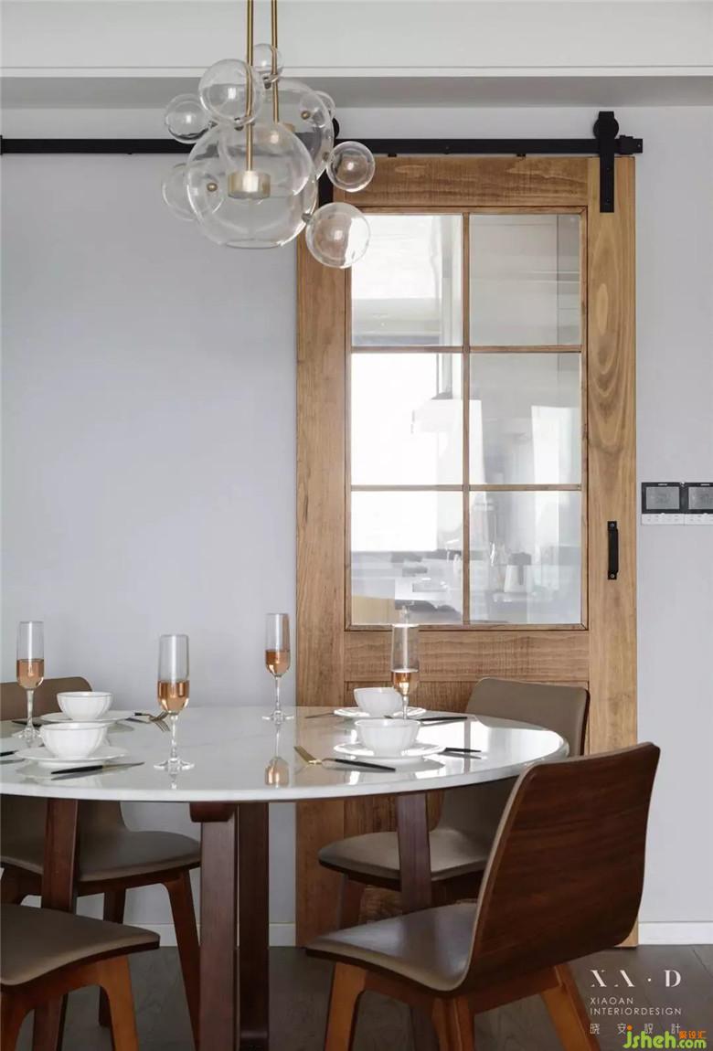 廚房的門(mén)選用了比較有意思的門(mén)型,谷倉(cāng)門(mén),一是可以用平移的方式又不占用廚房和餐廳的開(kāi)門(mén)空間,二是可以起到裝飾性的效果。谷倉(cāng)門(mén)選用格子玻璃,這樣有效利用了原本廚房的采光。