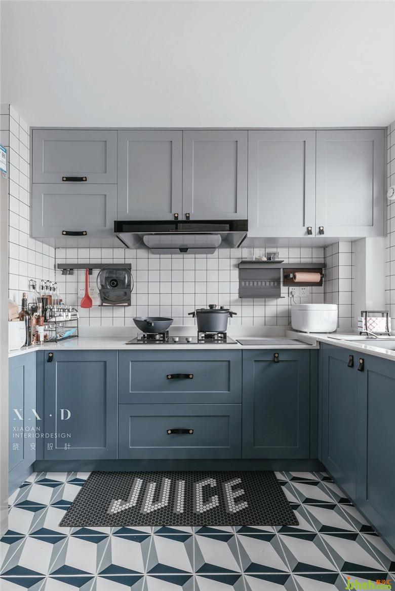 灰藍(lán)色櫥柜線條流暢,有點(diǎn)復(fù)古味道,但花樣獨(dú)特的地磚又帶來幾分新潮和藝術(shù)美,兩者相交,別有趣味。