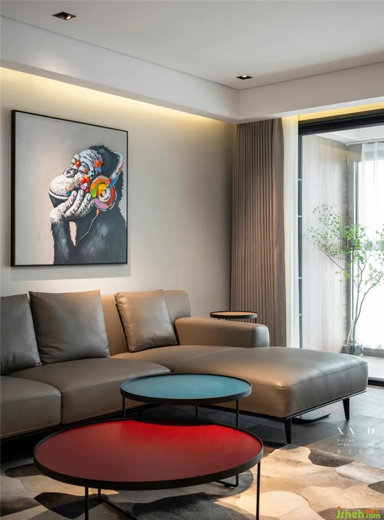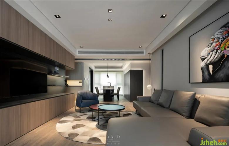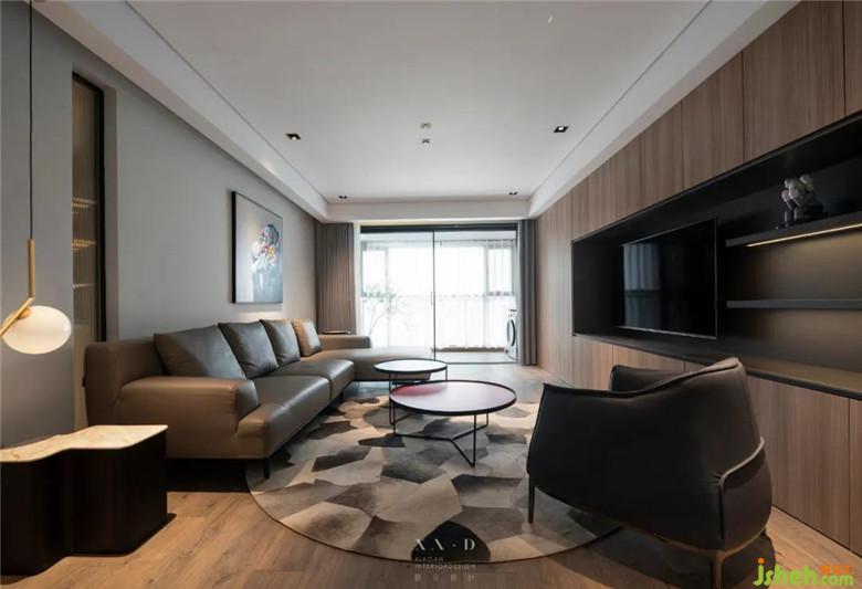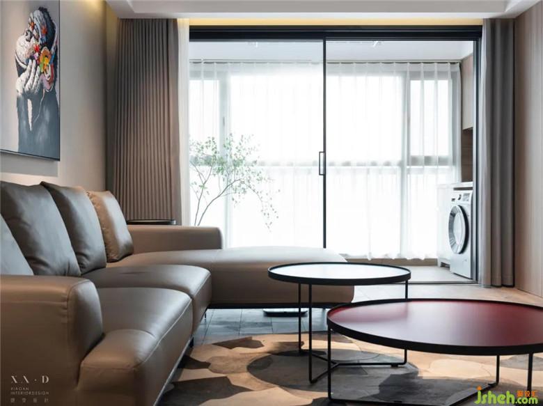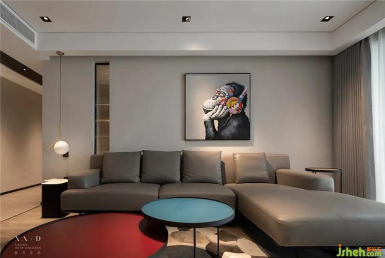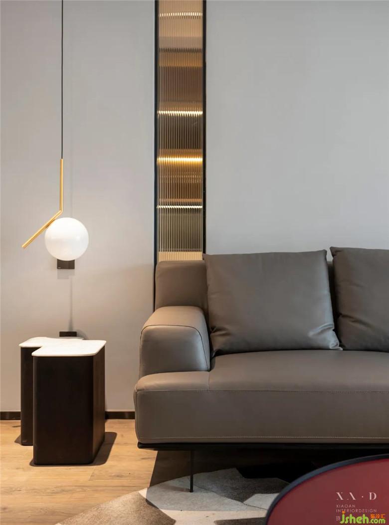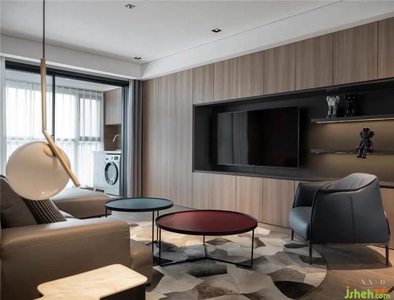 客廳中的層次感,在第一眼中便能分明地呈現(xiàn)。木質(zhì)的電視墻與地面相連,為舞步貢獻出“踢踢踏踏”的足音。短絨地毯鋪就一個圓形的舞池,使得音樂與呼吸都更加醉人。皮沙發(fā)的慵懶情調(diào),把簡單的陳設(shè)襯托得風(fēng)情萬種。