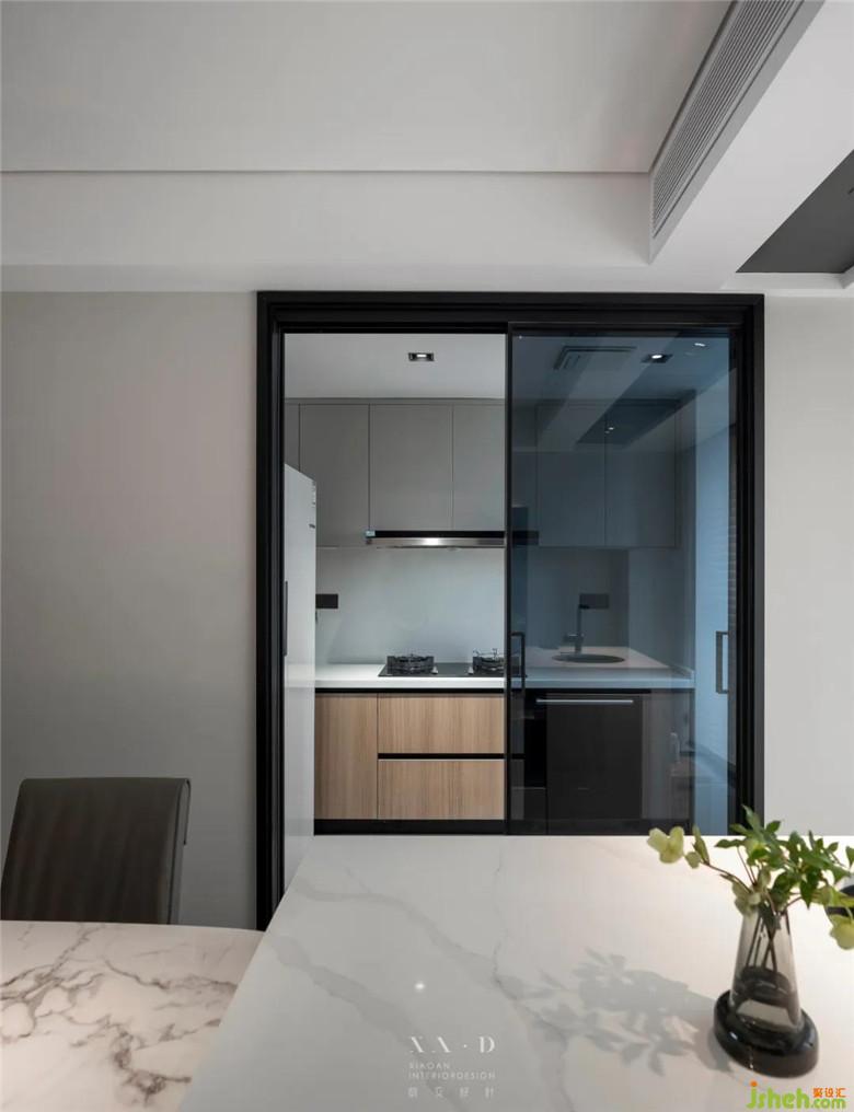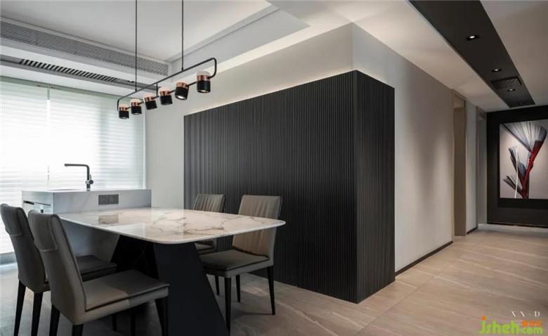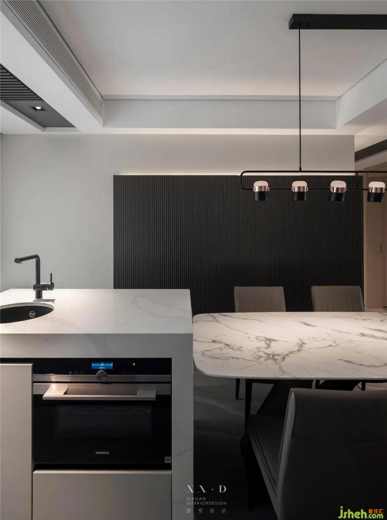 ▲ 大理石餐桌與島臺(tái)相連。