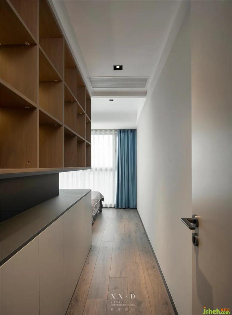 推開主臥右側的一扇小門,就能進入獨立的衣帽間。這個狹小的空間里,兩側的墻面上裝修公司都打造了頂天立地式的柜體,讓華衣美服、鞋子包包都有它們自己的去處。不安裝柜門的設計,讓衣物唾手可得,陳列也變成一門藝術。