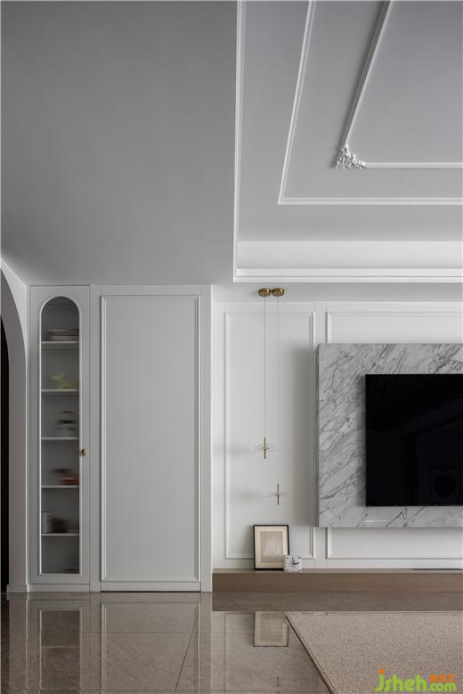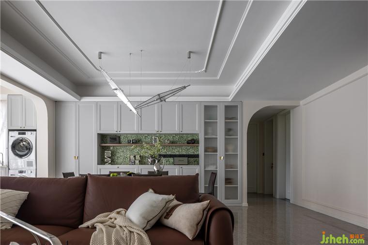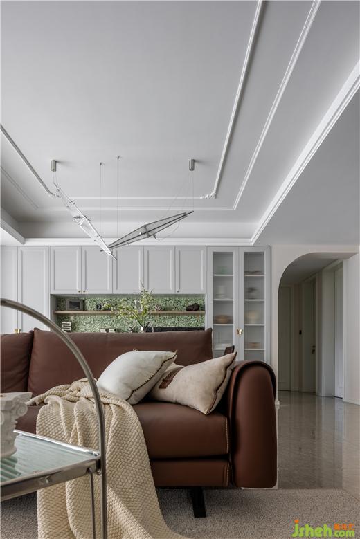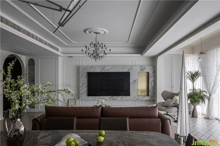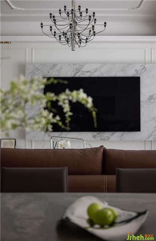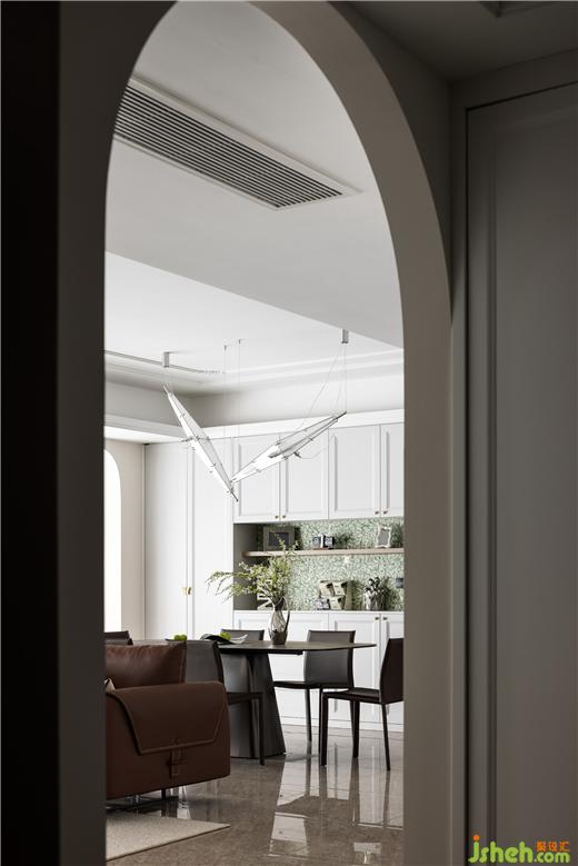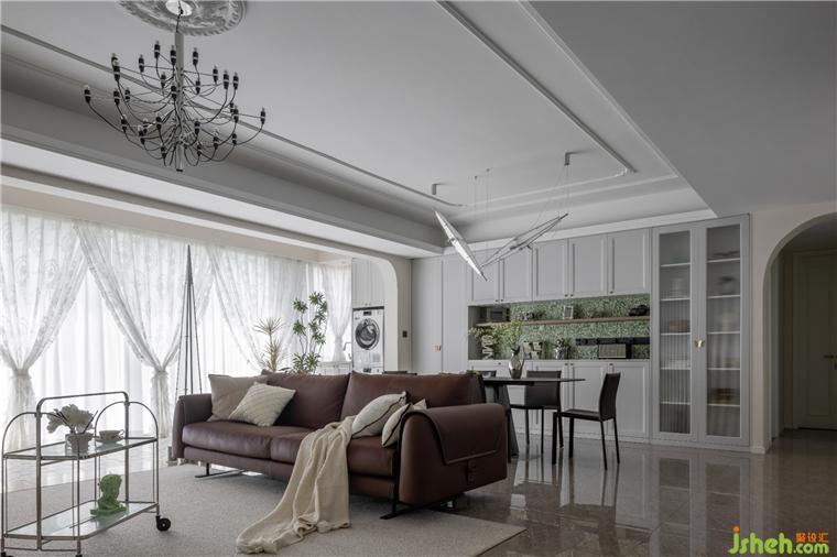 客餐廳空間大部分采用對稱結(jié)構(gòu),同時保留了法式風(fēng)格偏愛的流線造型,整體感覺非常優(yōu)雅。天鵝港豪宅設(shè)計在視覺感知上白色是比較柔和干凈的色調(diào),客餐廳以白色為主,搭配沙發(fā)的棕色,表達了別具一格的溫柔與優(yōu)雅。