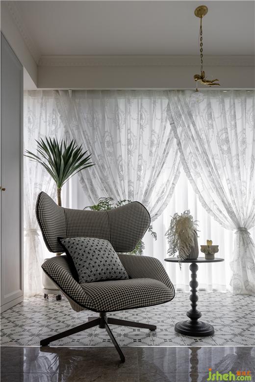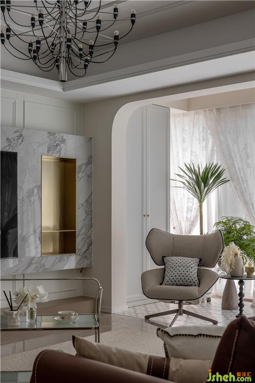 “從內(nèi)心深處,我們是希望房子能變得有個性一些的。”在客廳與陽臺空間的劃分上,弧線是比直線更具哲理感的選擇。天鵝港豪宅設(shè)計藝術(shù)借由曲線呈現(xiàn),也由對比產(chǎn)生。在沙發(fā)、可移動邊幾、雙層夢幻簾之間,形成了空間量感上的不對稱。