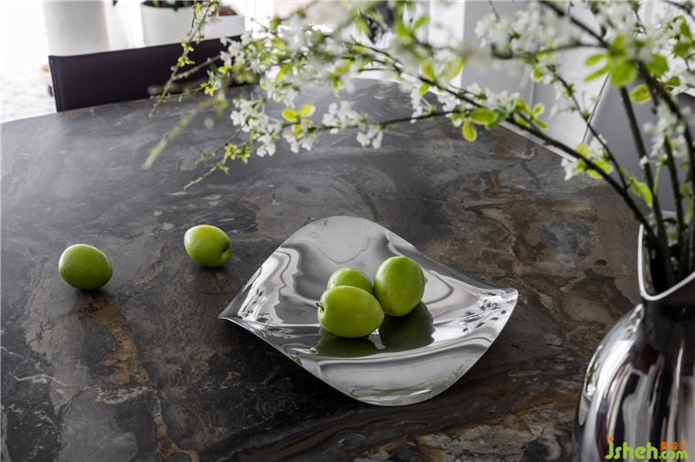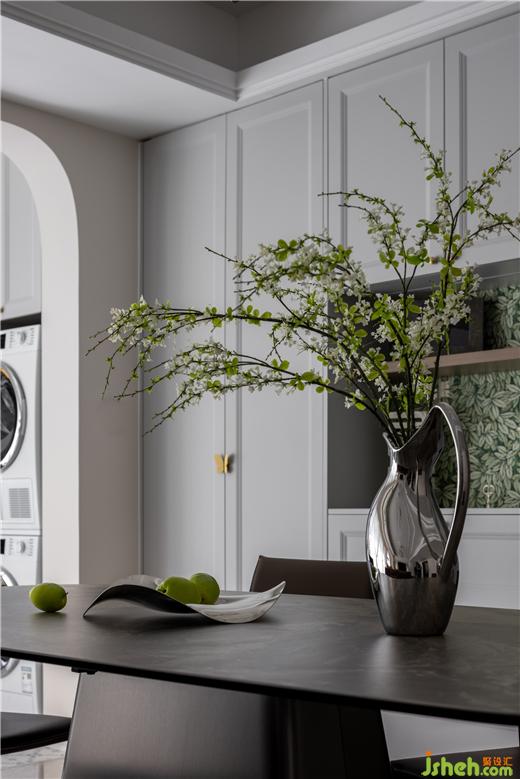 餐廳柜的中間部分,融入大片綠意,營造出一種悠然自得的田園之氣。天鵝港豪宅設計低垂交錯的幾何菱形燈盞,點亮的是舒適的用餐空間。在燈下,美食更加誘人,餐桌的紋理也愈發(fā)生動清晰。美景、美食、美酒,無一不浪漫。