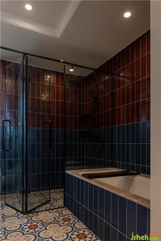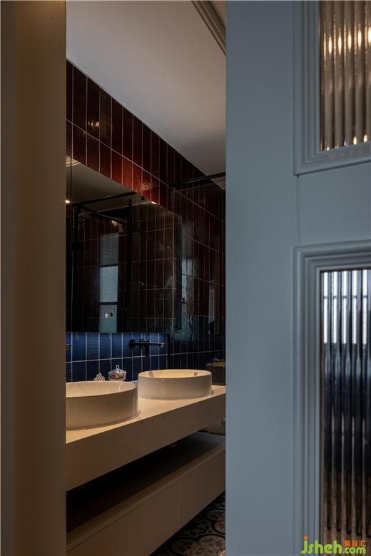 主衛(wèi)玩轉(zhuǎn)色彩,讓空間“撞”出獨特的美,在立面通過紅色與藍色的拼接,天鵝港豪宅設(shè)計塑造出強烈的視覺沖擊力,在地面點綴橙色和紅色,冷暖色相互碰撞,典雅氛圍與時尚個性并存。