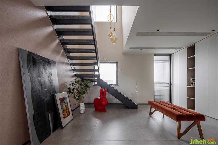 汲取玻璃的通透美感與波浪肌理的舒緩氣質(zhì),抒發(fā)溫柔輕盈的詩情。狀欲滴落的吊燈將光的純粹之力傳遞給潮酷擺件,復(fù)式裝修設(shè)計延展至絲絨座凳,勾勒出穩(wěn)定構(gòu)圖,豐富了視覺享受。