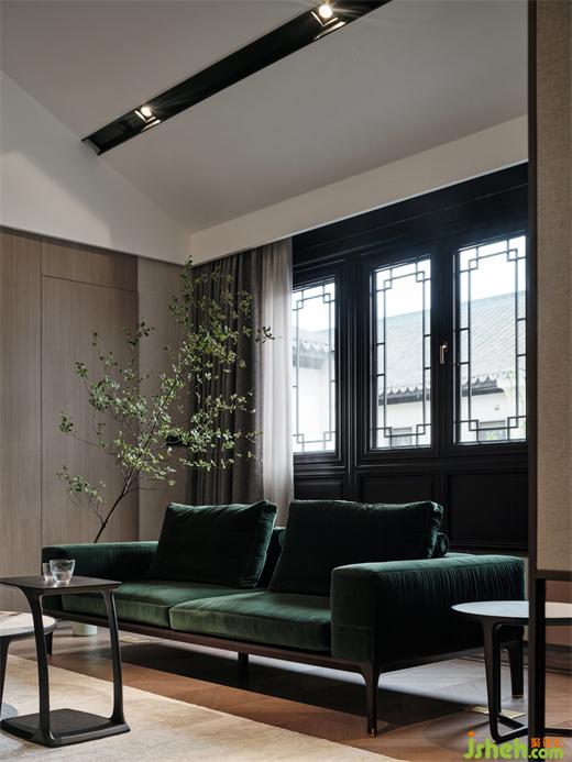 絲絨墨綠沙發(fā)被擺置在窗下,只需一個掀簾的動作,就生動描摹出“檐下生綠”的真趣,插枝截柳,點(diǎn)花襯葉,步步推進(jìn),熠熠動人。別墅裝飾看似隨意置于側(cè)旁的藝術(shù)畫作,不知不覺地引領(lǐng)跳色升華了家庭起居室的審美高度。