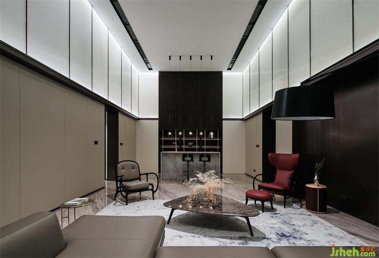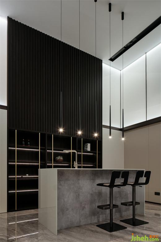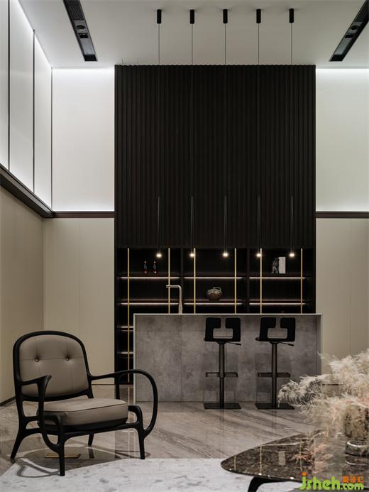 別墅裝飾通過一脈相承的設計智慧,鋪墊高雅的深色背景,融入格柵的藝術氣質,回應著光點的浪漫感,恰好契合淺酌慢品的氛圍。汲取清水混凝土的美,拓展水吧臺的純色細節(jié),讓個體與環(huán)境的關系更富層次。