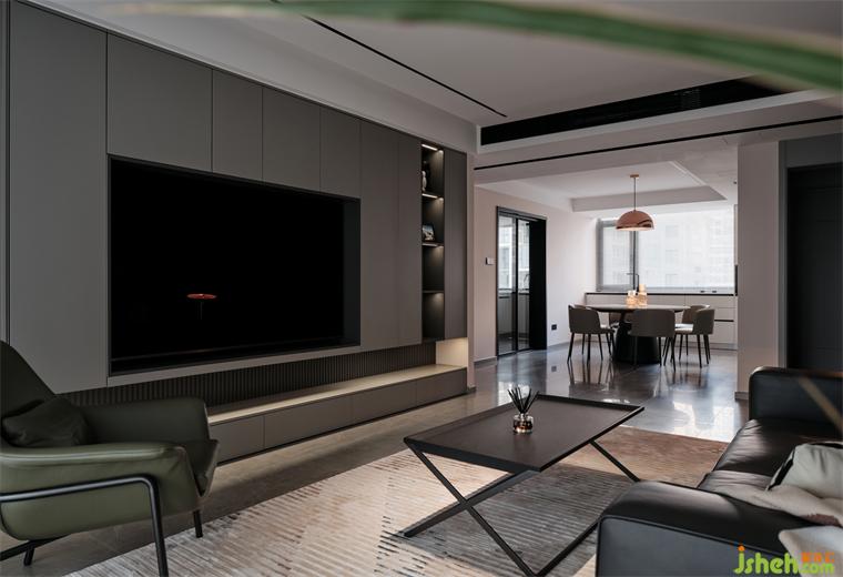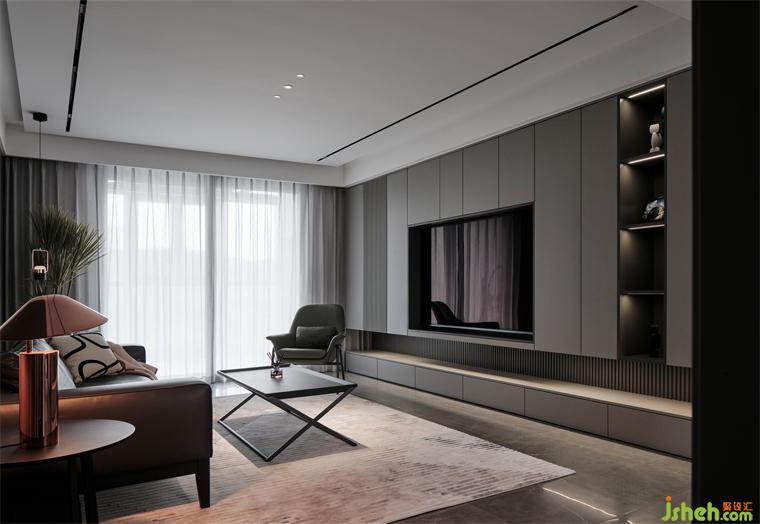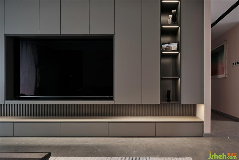 大平層裝修設(shè)計利用統(tǒng)一色塊收納儲藏空間,細(xì)分從上至下的凹凸比例,糅合均勻的條紋,化解了電視背景墻的沉悶感與壓抑感,衍生出側(cè)旁的展示空間,達(dá)成一種視覺上的重輕平衡。