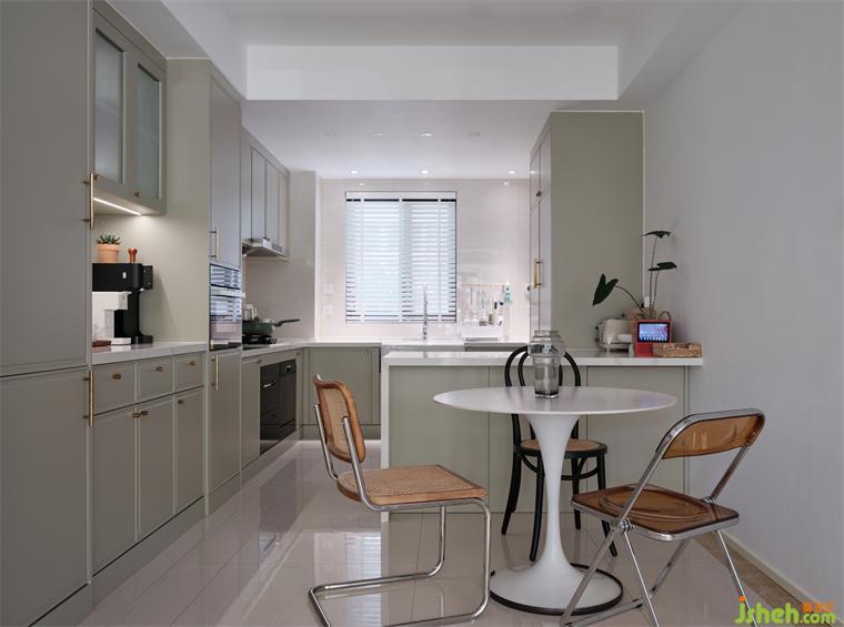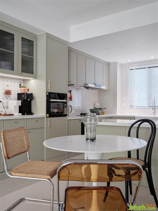 原本格局餐廳和廚房擠在一起,采光和使用空間都非常小,餐廳外移后,廚房擴(kuò)為敞開式,活動(dòng)空間更大,蘇州裝修設(shè)計(jì)增加島臺(tái)和早餐區(qū),臺(tái)面長度和儲(chǔ)物量都極巨擴(kuò)大,淡淡的薄荷綠使烹飪的氛圍更為活潑輕松。