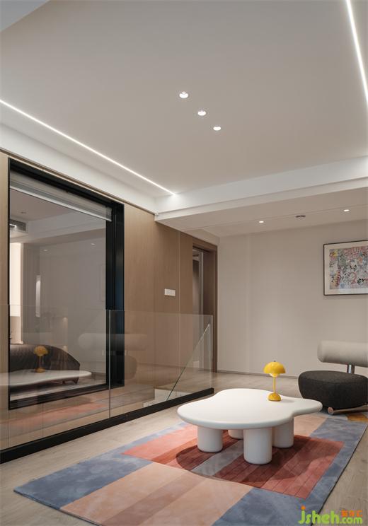 復式裝修設(shè)計構(gòu)筑視野明朗的落地窗,借燈帶強調(diào)空間氣勢與主次分區(qū),一抹灰調(diào)聚集了多維的交互體驗與跳躍的色彩溫度,在透明視感的輔助下,與不同場域形成奇妙的聯(lián)動性。The floor-to-ceiling window with clear vision is constructed, and the light belt emphasizes the spatial momentum and the primary and secondary division. A plaster tone gathers the multi-dimensional interactive experience and the jumping color temperature. With the aid of transparent visual sense, it forms wonderful interaction with different fields