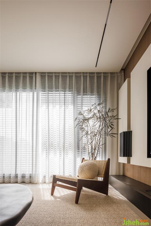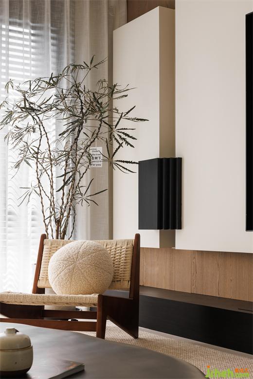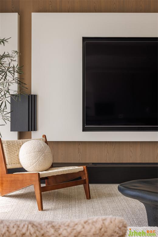 想要營造溫馨氛圍,藤編材質無疑是一個不可或缺的元素,天然的藤編單椅與地毯為空間帶來松弛感,同時提升美學氛圍。