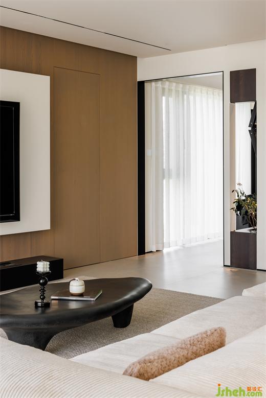 客廳沒有選擇整墻木飾面,避免空間顯得沉悶。大平層設計將門隱藏并化為電視背景墻的一部分,簡潔精致,視覺上完整性也更強,每一處細節(jié)都透露著對生活品質的追求和對美學的尊重。