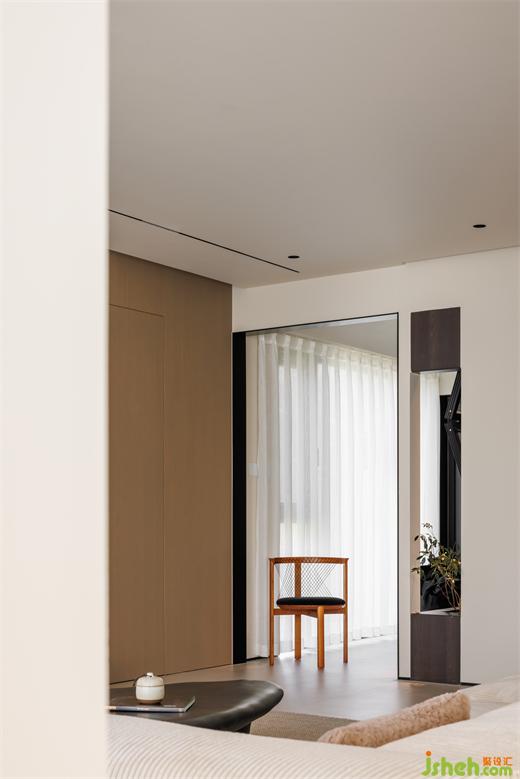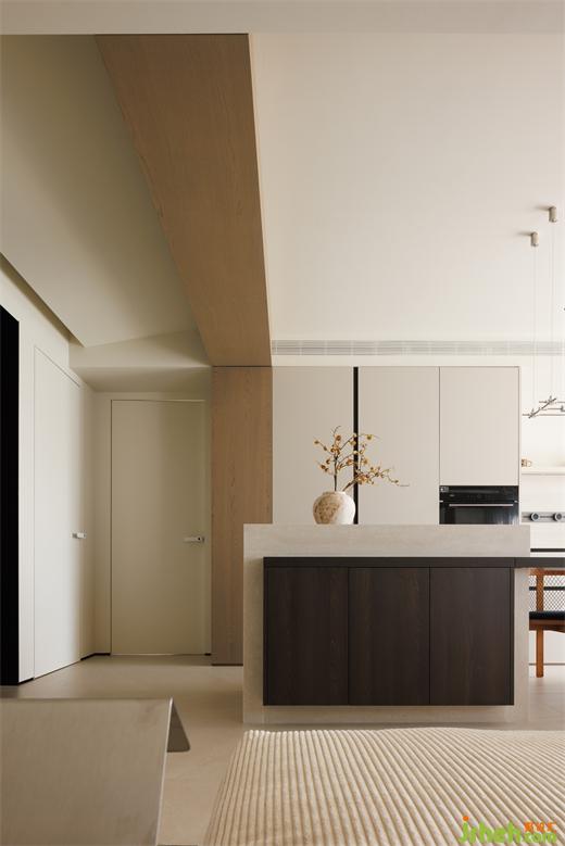 大平層設(shè)計(jì)木飾面從客廳頂部延續(xù)至餐廳,使得色調(diào)上形成較好關(guān)聯(lián),避免了大面積墻體的單調(diào)感,入眼即舒心。