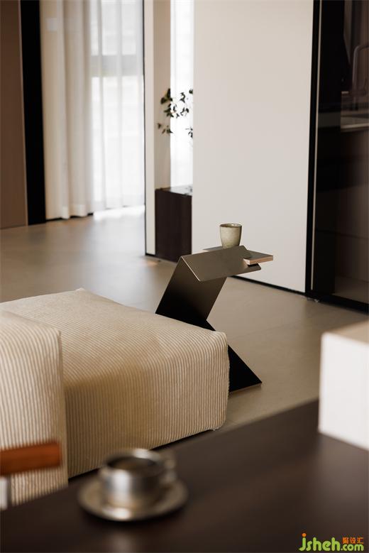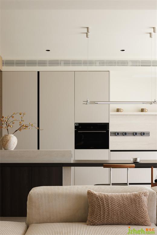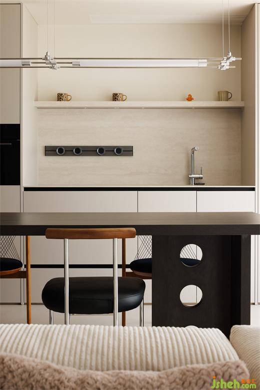 餐廳做了黑胡桃木+奶白色的島臺(tái),兩種顏色的碰撞,使空間更富有想象力。