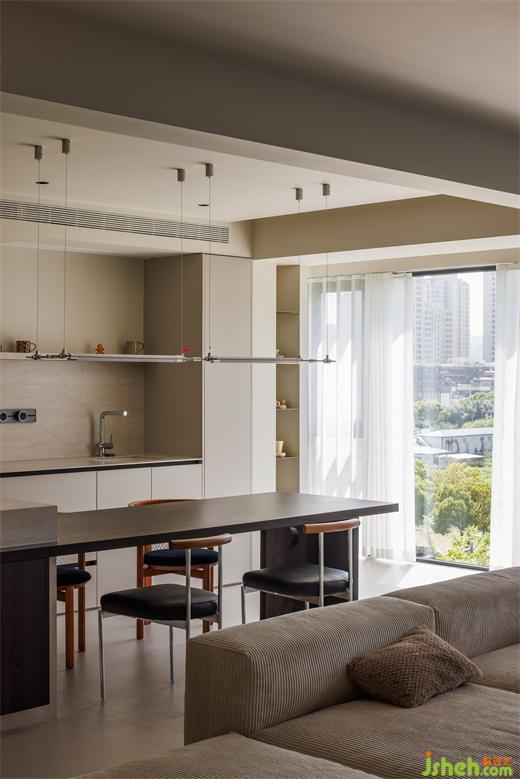 大平層設(shè)計一側(cè)的玻璃窗將自然之景框住,在這里用餐,真的會被這樣舒緩放松的氛圍所深深吸引,讓人能夠慢下來,靜靜感受生活之美。