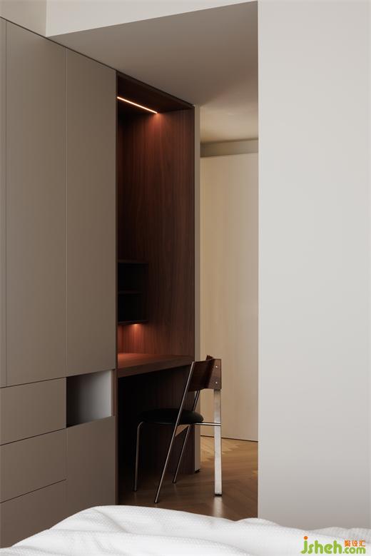 臥室的極度舒適性源于設(shè)計師對空間尺度的把握,充分考慮居者需求,在室內(nèi)定制衣柜,預(yù)留梳妝臺,便于清晨夜晚的對鏡梳妝。