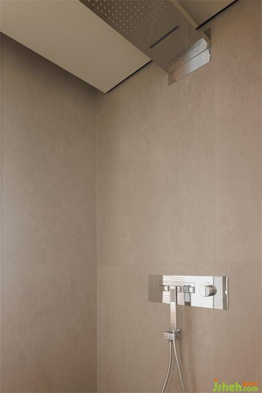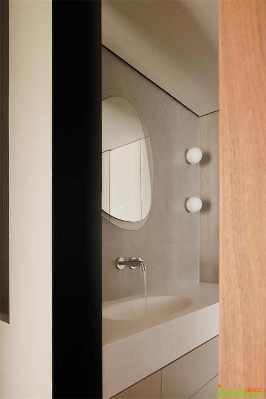 浴室之內(nèi),洗漱臺、浴缸、淋浴區(qū)依次展開,布局合理,功能明確。色調(diào)溫和的柔光磚與整屋色調(diào)相契合,給予視覺上最佳的舒適感。