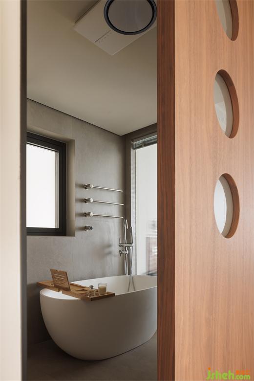 臥室與浴室的隔斷是一扇木質(zhì)移門,一推一拉,輕松切換不同狀態(tài),暖色系的外觀很好地提高了空間感與顏值。