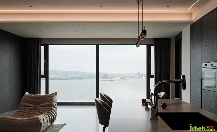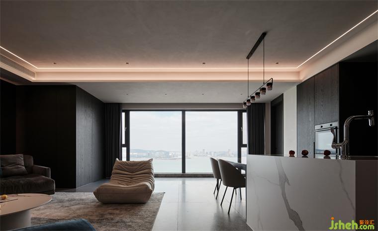 客廳,充分利用場域條件打造了一個高闊、通透的空間,喚起感官和身體的雙重體驗。豪宅設(shè)計深灰色調(diào)的運用強化空間的景深感,獨特的場景營造展現(xiàn)恰到好處的家的氣度。