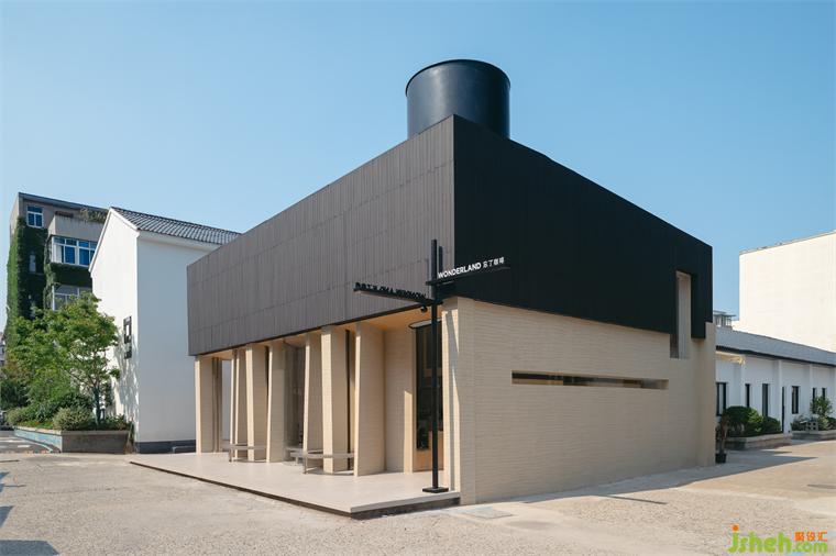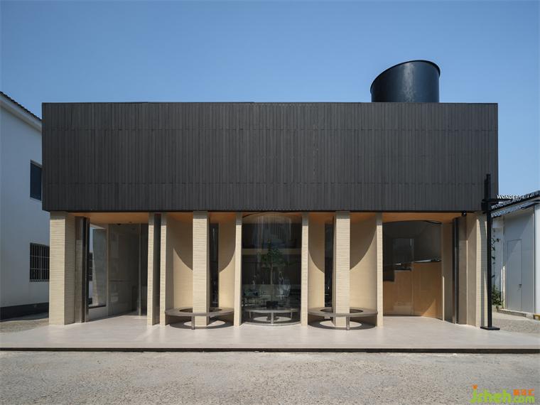 四周皆為低矮樓房,甄選火燒木與夯土肌理感外墻漆,形成清晰的分層。屋頂增添圓筒型天窗,擬態(tài)傳統(tǒng)建筑的煙囪形態(tài)。
