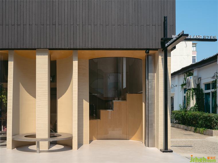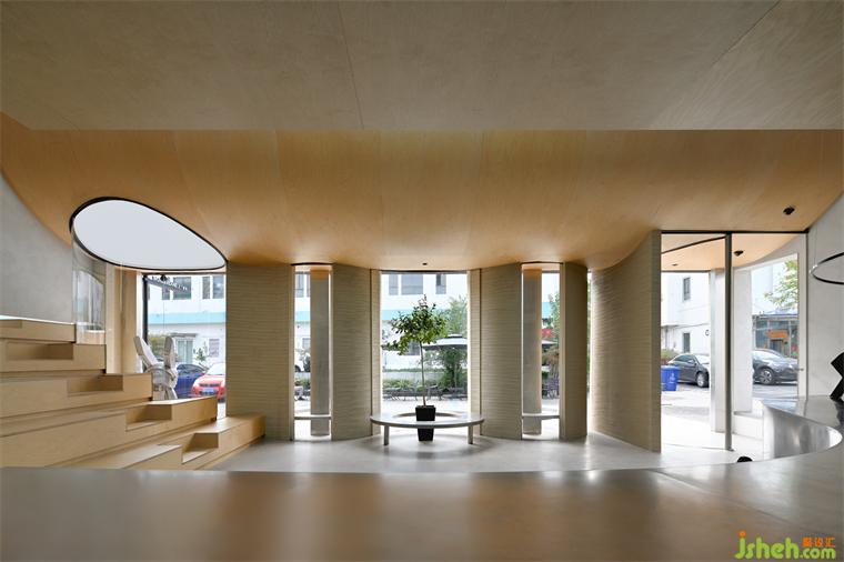 在立柱之間嵌入三個(gè)圓形卡座,將其中兩個(gè)包容進(jìn)室內(nèi),咖啡廳設(shè)計(jì)剩余一個(gè)設(shè)置在室外,運(yùn)用玻璃的剔透性保持統(tǒng)一與簡(jiǎn)潔,通過(guò)固定形態(tài)創(chuàng)造驚喜體驗(yàn)。