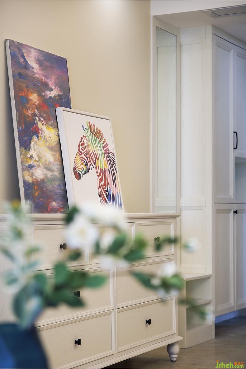 記憶深處那冷清舒適的色彩,渲染了光陰。主臥以輕柔煙藍(lán)與田園藤藝為主色調(diào),床頭柜上的白色飾品與散發(fā)清香味道的木色枝條,與白色調(diào)床柜相互襯托,富有情調(diào)又有淡淡的溫柔。