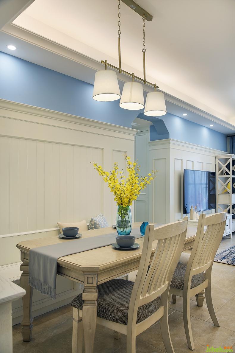 餐廳部分用淡藍(lán)桌布配上陶瓷碗,與獨(dú)具風(fēng)格的花瓶相得益彰,排成條行的吊燈也為餐桌添上一絲浪漫的情調(diào),餐邊柜上的飾品和掛畫也極具時(shí)尚與獨(dú)特魅力。室內(nèi)設(shè)計(jì)師