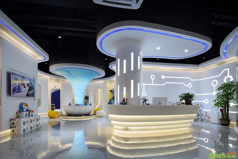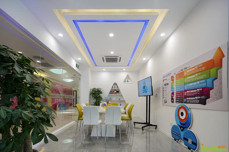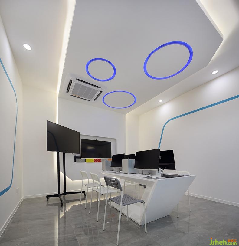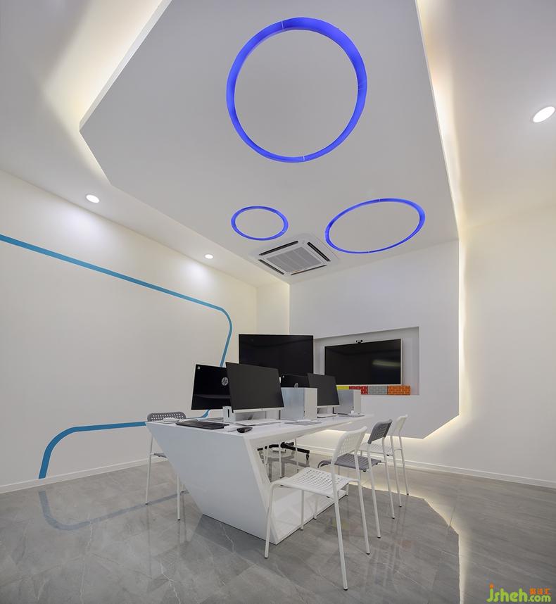 辦公區(qū)的布置十分簡(jiǎn)潔利落:潔白的天花頂布上藍(lán)色圓形燈管,白色平行四邊形的書桌上擺著黑屏白底電腦,灰色和白色的椅子相互穿插……一切都剛剛好。
